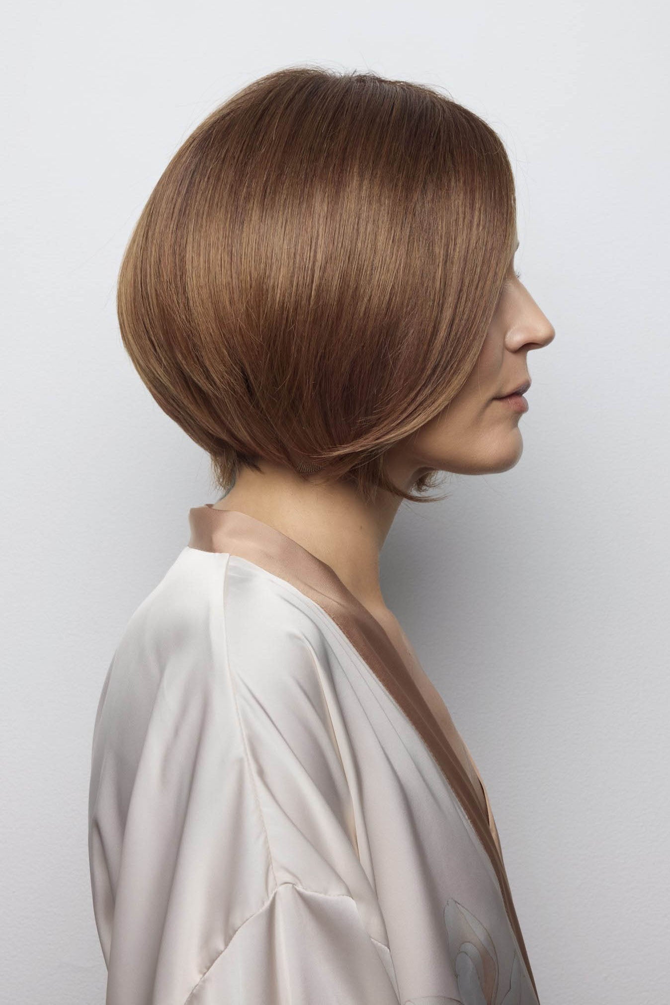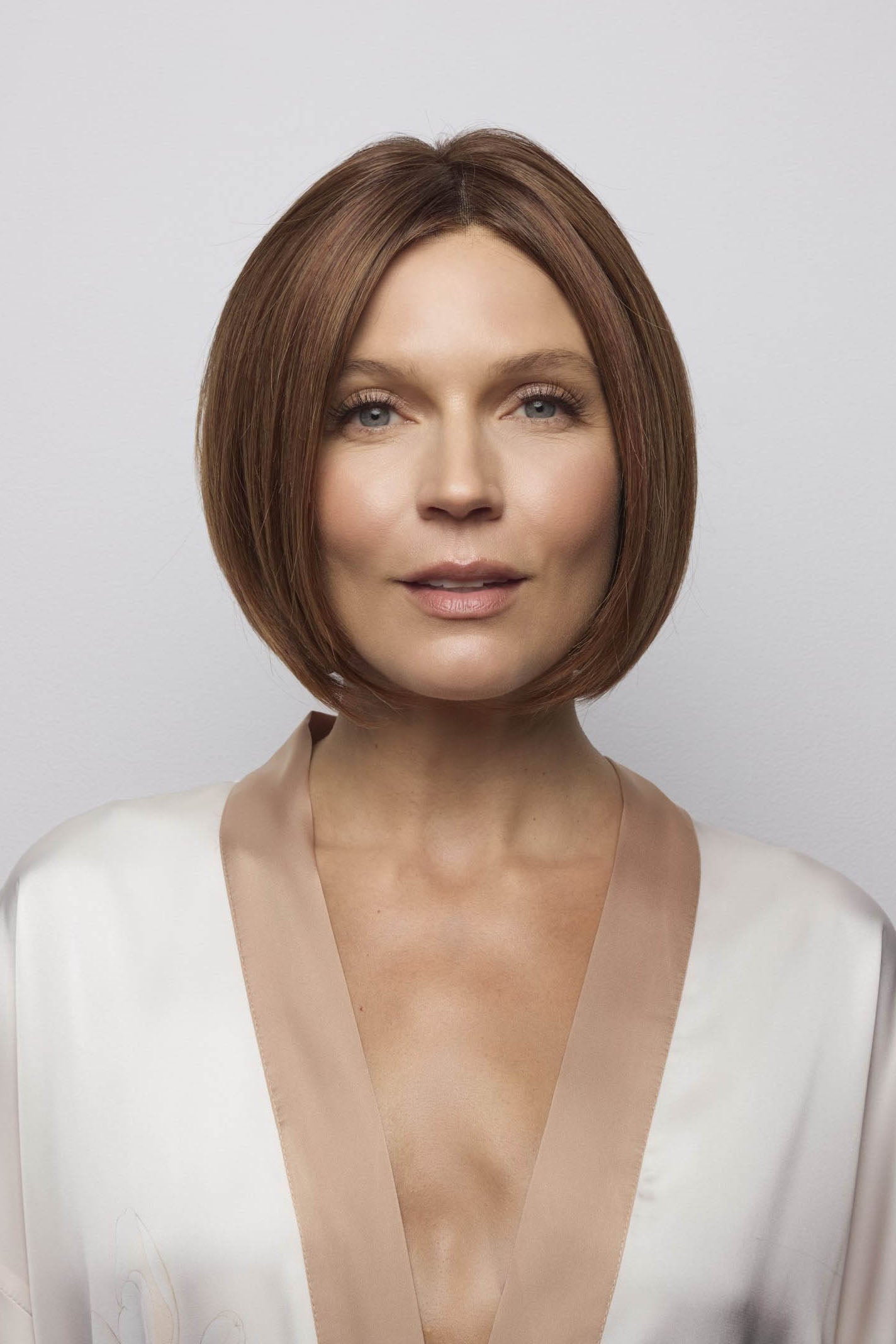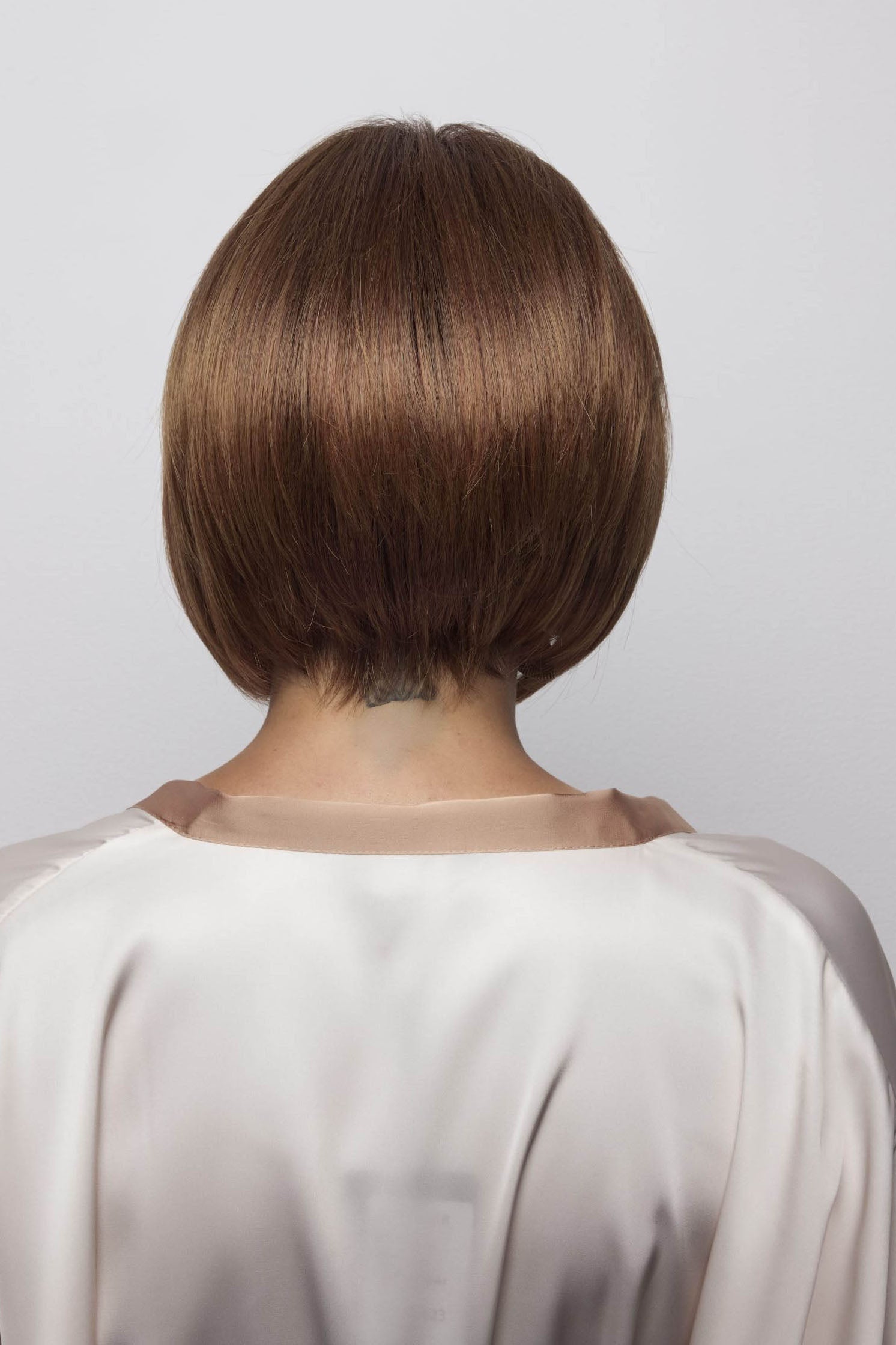 Ayumi from our Noriko Collection is a short-length blended fiber wig. This straight, ready-to-wear bob features a chic center part and a softly graduated shape that frames the neckline with elegance. Long, invisible face-framing layers and medium density create a polished yet versatile style, perfect for everyday wear or special occasions. Available in our NM (Natural Movement) fiber, a high-quality blend of synthetic and heat-friendly fibers that reduces shine while maintaining a natural look. Ayumi is designed with an extended lace front and soft lace part for a natural appearance, with adjustable tabs in the back-nape area for a secure and comfortable fit. The result is a stylish, natural-looking wig that is easy to wear.