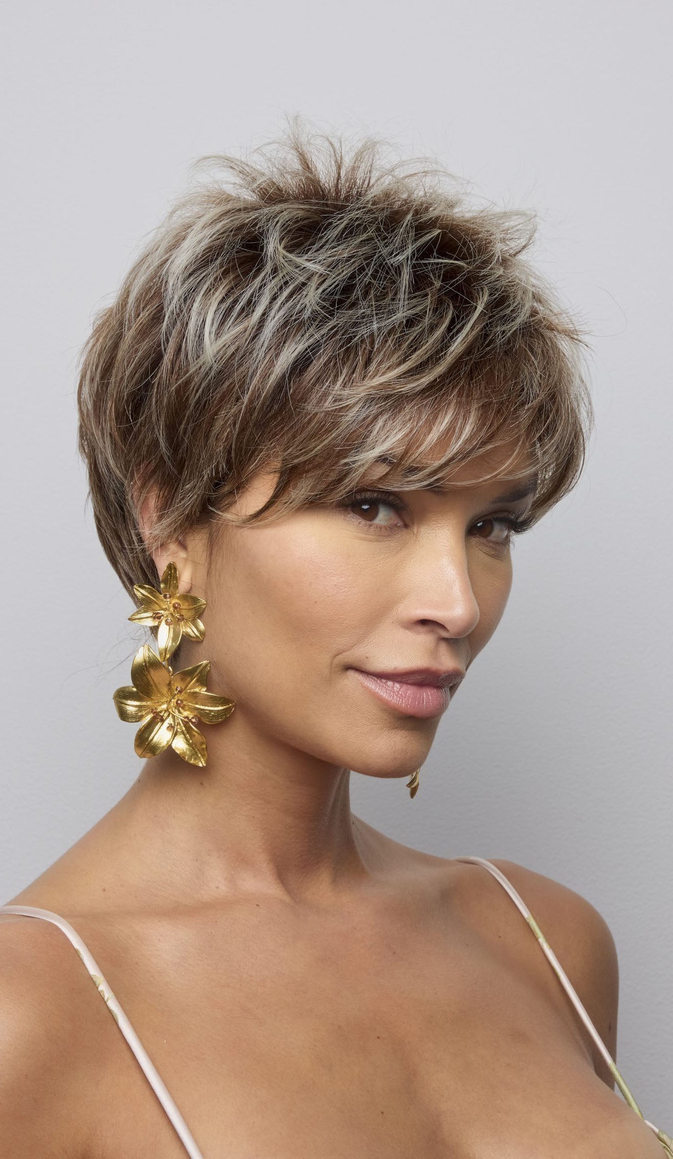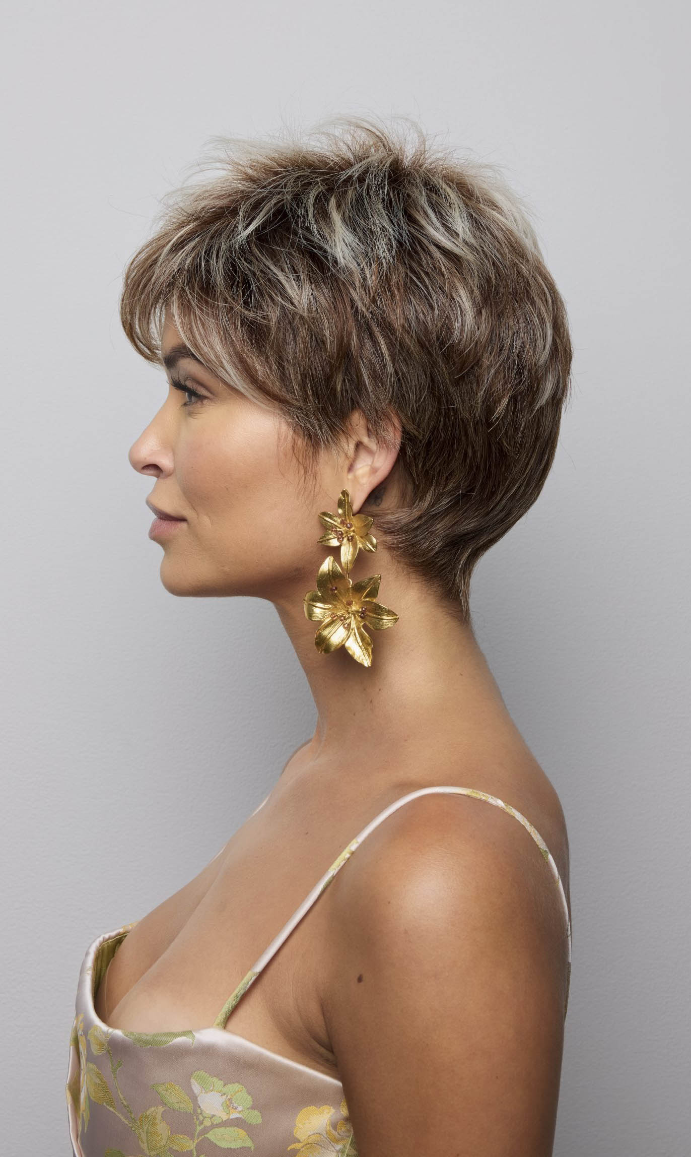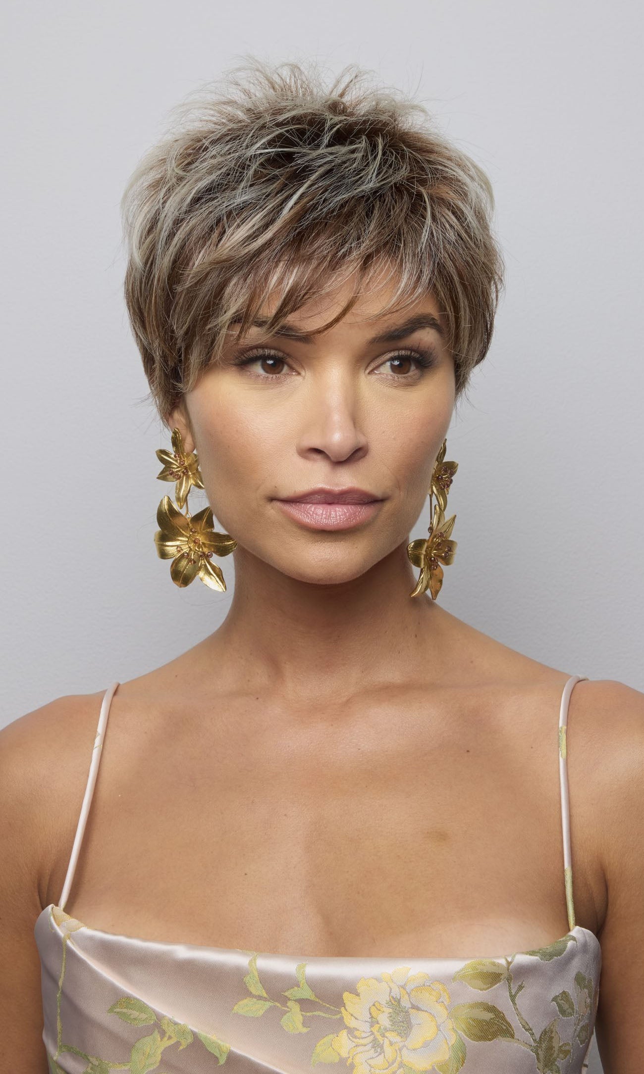 Rin from our Noriko Collection is a short-length, heat friendly wig. This straight, ready-to-wear pixie features a textured cut with a sleek, longer fringe for a stylish, modern look. Rin is machine made with an extended lace front, providing a natural hairline and versatile styling options. Adjustable tabs in the back nape area ensure a secure and comfortable fit. The result is a comfortable fit with a natural look that is both fashionable and easy to wear.